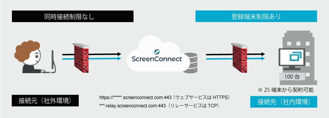 通信用件についてですが、*.screenconnect.com (HTTPS 443番ポート)と*.screenconnect.com (TCP 443番ポート)のアウトバウンド通信を許可すれば問題ありません。